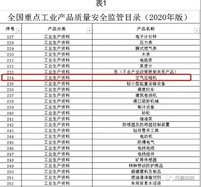 2020年,质监局对空压机产品质量的监管力度加强,在监管要求有(见表1):