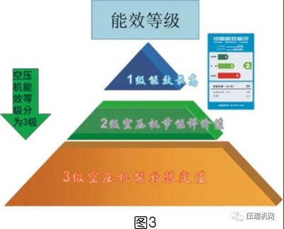 ②“能效等级”是对同类产品能效范围内划分出的若干个效率等级。是国家实施能效标识制度的依据,是引导消费者购买节能型产品的直观参考标准。空压机能效等级分为3级,其中1级能效最高,3级能效最低。空压机节能评价值不大于2级规定。