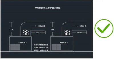 6、进风口需避免西晒太阳,造成环境温度上升,高温报警。如果工厂环境较差,灰尘多,应加装一通风导管,将进气端引向空气比较干净的地方。导管的安装必须便于拆装,以利维修,安装尺寸参考空压机外部尺寸。