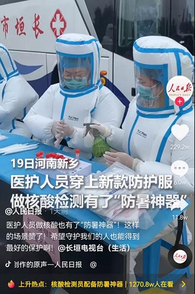 据《人民日报》公众号的推文介绍,一款由防护衣、呼吸管以及过空气压缩装置组成的新型防护服开始在许多地方应用,不仅能调节温度,还能蒸发汗水,让衣物不会湿透贴在身上。这条推文在短短2分钟之内就收获了10万次点击,大量网友留言为这款“人性化”的新型防护服点赞,更有网友表示,希望能够在全国推广。此外,《人民日报》抖音号上也发布了相关视频,目前已累计有229万次点赞。